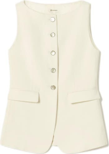 Elevate your wardrobe with this sleek sleeveless vest. It features a sophisticated square neckline and a flattering, structured fit that gracefully skims the hips. Its custom gold-tone metal shell buttons and symmetrical welt pockets add polished refinement and practicality. This vest is perfect for formal events, business meetings, or chic daily wear.