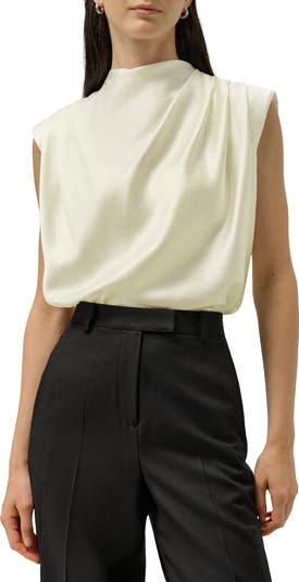 This mock neck tank top is a modern wardrobe essential, blending clean structure with fluid elegance. Crafted from machine washable silk, the regular fit flatters This mock neck tank top brings modern refinement to everyday dressing. Crafted from machine-washable silk, it offers the softness and sheen of traditional silk with the practicality of easy care. The regular fit drapes effortlessly on the body, while soft pleats and built-in shoulder pads lend quiet structure and a touch of sculptural elegance. An invisible back zip ensures a smooth, uninterrupted line, and the clean mock neckline frames the face with subtle sophistication. Versatile and timeless, this piece transitions seamlessly from desk to dinner. Pair it with tailored trousers for a polished office look, or style it with a flowing skirt or wide-leg pants for an elevated weekend ensemble. Whether layered under a blazer or worn on its own, it’s a go-to staple for refined, effortless style.