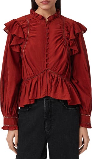 Airy ladder stitching trims this dramatic cotton-blend top romanced by fluttering ruffles and billowy sleeves.