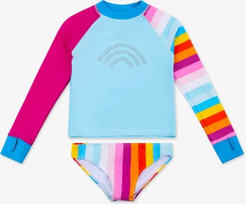 The perfect sporty pairing, this summer ready rash guard set features bold multicolor stripes and a rhinestone rainbow detail