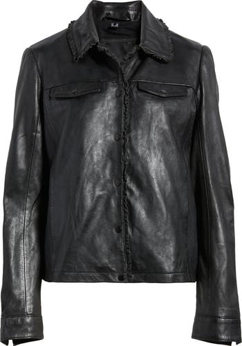 Ruffles along the collar and placket update the look of this moto jacket cut from buttery soft lambskin leather with a vintaged finish that feels like you've owned and loved it for years.