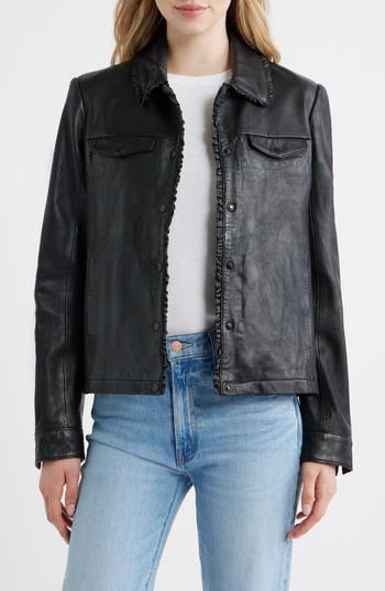 Ruffles along the collar and placket update the look of this moto jacket cut from buttery soft lambskin leather with a vintaged finish that feels like you've owned and loved it for years.