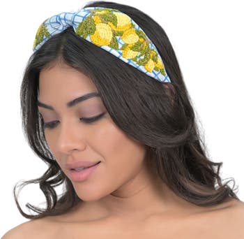 Elevate any look with this lemon tree-inspired embroidered headband. Handcrafted, this luxe piece is adorned with intricate threadwork and finished with a neat knotted center. An elegant hair accessory that will add a sophisticated finish to any ensemble.