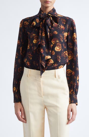A painterly floral print in autumnal hues inspired by Burberry's signature sand colorway enriches this silk crepe shirt finished with a scarf-like pussybow tie.