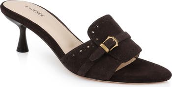 Delicate perforations and an artful buckle stand out at the vamp of a cushioned slide sandal lifted by a cylindrical heel.