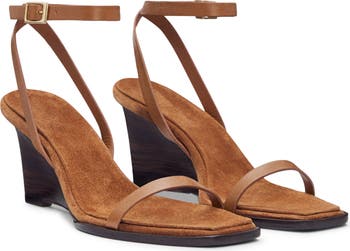 Elegant and minimalist, this square-toe sandal is lifted by a carved woodgrain wedge heel.