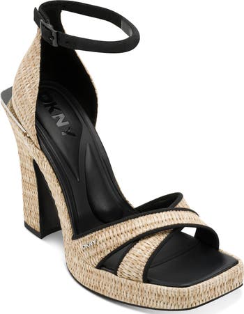 Gleaming hardware and contrast trims stand out against the finely woven upper of a boho-cool sandal lifted by a chunky platform and soaring block heel. A cushioned footbed and built-in arch support provide all-day comfort.