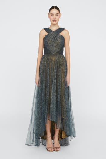 Sunburst pleated lace high low gown with criss cross halter neck and draped bodice detail.