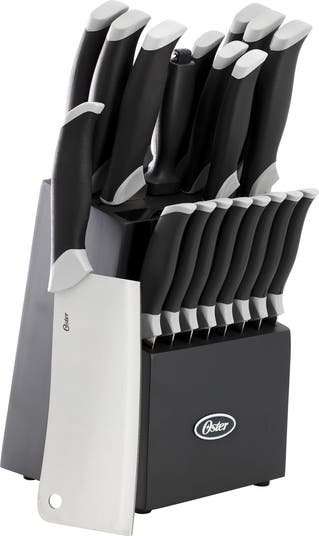 The Oster Lindbergh 22 Piece Stainless Steel Cutlery Set with Storage Block offers an exceptional blend of style and functionality for any kitchen. This comprehensive set features high carbon stainless steel blades with serrated edges, ensuring precision and durability for all your culinary needs. The set includes an impressive array of knives, including an 8" chef knife, an 8" carving knife, a 7.5" bread knife, and more, all housed in a sleek, hardwood storage block. Each knife is crafted with stamped blades and designed with a soft grip handle in black, enhancing both comfort and control during use.In addition to its versatile range of cutlery, the Oster Lindbergh set includes a pair of kitchen shears and a sharpening steel to maintain your knives' optimal performance. The hardwood storage block not only keeps your knives organized but also adds a touch of elegance to your kitchen countertop. Designed for hand wash only, this cutlery set is perfect for those who appreciate high-quality kitchen tools that blend form and function seamlessly. Whether you're a home cook or a seasoned chef, the Oster Lindbergh 22 Piece Cutlery Set is a valuable addition to your kitchen arsenal.