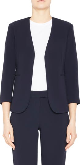 A signature clean-lined aesthetic informs a collarless jacket cut with three-quarter sleeves.