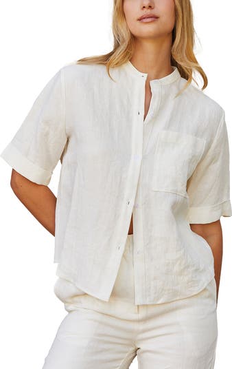 Made from 100% linen, this relaxed-fit shirt features a button-up front, short sleeves, and a patch pocket, offering a comfortable and breathable option for warmer days.