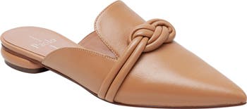 Tubular straps interlock at the vamp of a loafer-inspired leather mule fashioned with a sleek pointy toe.