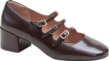 A walkable block heel elegantly lofts a patent-leather pump topped by a trio of mary jane straps that elevate your look with retro appeal.