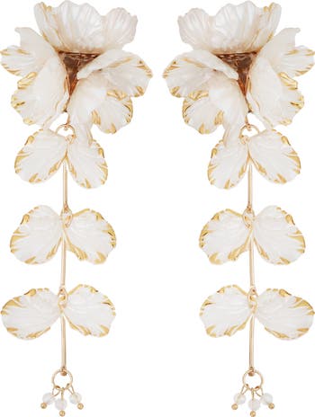 Accents of 14-karat-gold plating catch light on these enamel flower earrings anchored with a dangling trails of leaves.