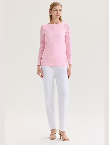This classic soft knit tunic features an intricate tonal burnout design that adds subtle texture and dimension for spring and summer styling. Fully lined for comfort and coverage, it offers an easy, flattering fit perfect for daytime events, brunches, or casual evenings. Effortlessly polished, it pairs beautifully with white pants or lightweight skirts for warm weather occasions.