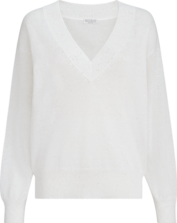 The construction of the lightweight Diamond yarn combines the fresh, natural touch of the linen and cotton fibers with small sequins embedded into the yarn, spreading delicate sparkling reflections throughout the garment’s surface.