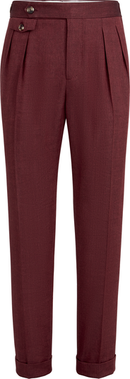 - Zip closure with button, metal hook and backing buttonSlanted front pockets with watch pocketDouble pleatBuckles on the sideBack welt pockets with flap and buttonCupro lining to kneeCuffed hem