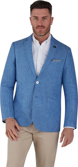 This Linen Blazer in Mid Blue is perfect for men who want to stay stylish yet comfortable. This classic design is lightweight and flattering, made with high quality material. It features multiple pockets, including one for a pocket square, and white contrasting buttons that stand out at the fastening and cuffs. It is finished with a dark embroidered RB bull logo on the lapel, offering a truly polished look for any casual or smart summer occasion. Available in sizes small to big and tall.