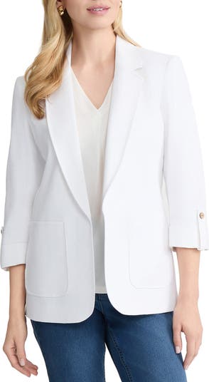 Roll-tab sleeves frame this polished open-front blazer cut from a lightweight linen blend.