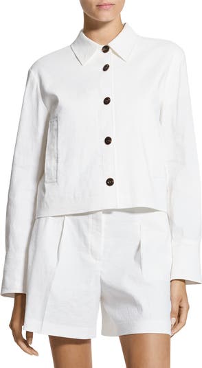 Perfect to layer or wear solo, this minimalist cropped shirt-jacket is topped with a sharp point collar and features hidden-button cuffs.