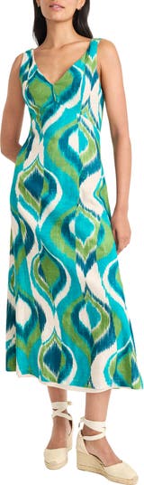 A bright pattern brings fresh energy to this resort-ready midi cut from a breathable linen blend for a comfortable fit even on hotter days.