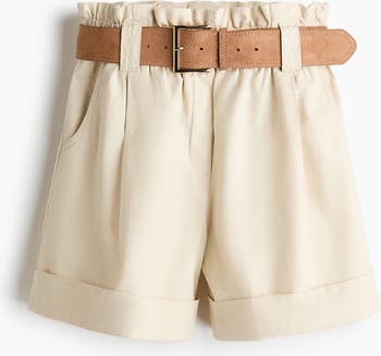 Loose-fit shorts in twill made from a linen, lyocell and cotton blend. Features an extra-high, elasticated paper bag waist with a belt and a fake fly. Open front pockets, patch back pocket, pleats at the front and sewn-in turn-ups at the hems.