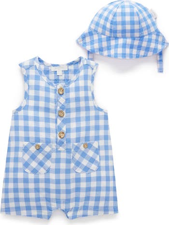 Purebaby Linen Blend Romper & Sunhat, Main, color, Ocean Gingham