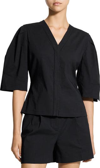 Cut from a lightweight linen blend, this top is nipped-in at the waist and framed by pleat-trimmed puff sleeves to sweeten the silhouette.