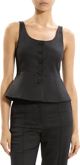 Sculptural seaming shapes the silhouette of a line-forward vest swirled with a low-key peplum.