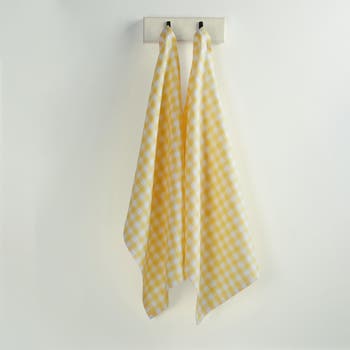 Add color and a classic pattern to your kitchen with our Gingham check kitchen towels. Hand-crafted of 100% pure linen by our skilled artisans, these tea towels are up for any kitchen task. Dry dinnerware or add a sparkle to glassware with these absorbent and quick drying linen towels. The hanging loop keeps towels handy for cleaning up spills or drying hands. Available in sunny hues and arrives in a set of two.