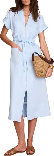 Utility dress in a midi silhouette featuring a classic collar, V-neckline. short sleeves, cinched drawstring waist, four square pockets, contrast stitching with a zip fastening through the front.