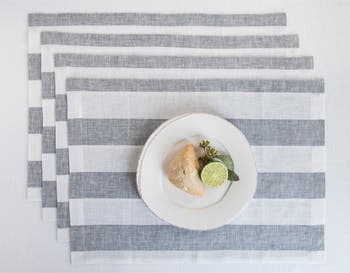Whether you're entertaining indoors or poolside, the bold stripes of our Cabana Stripe Placemats brings any table a statement look that sets an inviting scene. Made of 100% pure linen, our set of four placemats provide classic style that pairs well with your favorite dinnerware and flatware for casual entertaining. Complete the look with other linens from our Cabana Stripe Collection, including a coordinating table runner and dinner napkins.