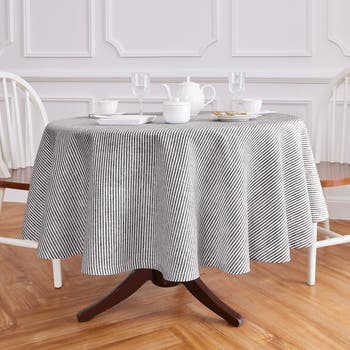Narrow stripes bring a casual accent to a table setting and mix well with a variety of patterns. Our 100% linen stripe round tablecloth is perfect for casual get-togethers or everyday dining. Available in a variety of colors and sizes. Our round tablecloth size charts (for exact measurement): 1) Medium - 60 Inch Round, 2) Large - 70 Inch Round.