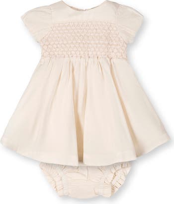 Our adorable dress in a soft organic cotton and linen blend has a beautiful smocked bodice to frame her face with simple charm. Features sweet puff sleeves and a zipper closure at the center back. Comes with matching diaper cover. Ready for every picture perfect moment.
