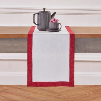 We designed our Festive Edge table runner with holidays and celebrations in mind. Hand-crafted of pure linen in the center with a hint of shimmer on the border, this table runner will elevate your tablesetting for any occasion. Use it on its own or pair it with placemats and napkins from the Festive Edge Collection. Our table runner size charts (for exact measurement): 1) One Size - 14 x 36 Inch, 2) XX-Small - 14 x 48 Inch, 3) X-Small - 14 x 60 Inch, 4) Small - 14 - 72 Inch, 5) Medium - 14 x 90 Inch, 6) Large - 14 x 108 Inch, 7) X-Large - 14 x 120 Inch, 8) XX-Large - 14 x 132 Inch, 9) Medium/Large - 14 x 144 Inch, 10) Large/X-Large - 14 x 156 Inch.