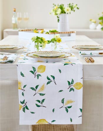 Our Botanical Lemon table runner features tree-ripened lemons and bright green leaves scattered on 100% pure European linen, creating a fresh summery palette. We love this pattern for setting a vibrant, warm-weather table settings indoors, around the pool or patio