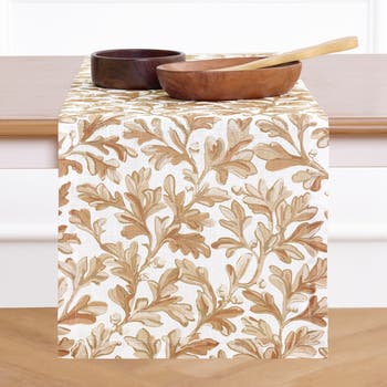 Add a botanical fall vibe to your tablesetting with our Fallen Leaves table runner. Featuring a pattern of scattered oak leaves in autumnal tones, this leafy pattern was designed for Fall and Thanksgiving entertaining. Hand-crafted of 100% pure linen by our skilled artisans, finished with a generous hem and mitered corners. Available in a wide variety of sizes