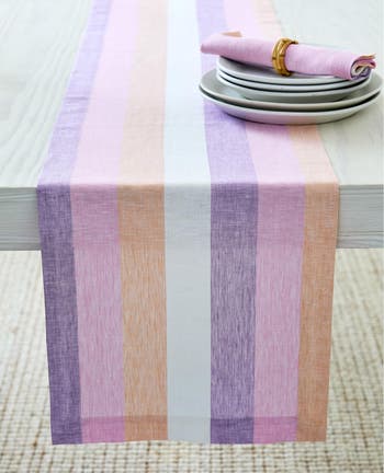 Almost like the delicious flavors of our favorite Italian ices, our Gelato stripe table runner is perfect for spring or summer parties and celebrations. Woven of 100% pure linen in the sweetest stripe colors, this table runner pairs perfectly with our coordinating napkins, placemats or mixed with any solid color of the stripe painterly stripe pattern. Our table runner size charts (for exact measurement): 1) One Size - 14 x 36 Inch, 2) XX-Small - 14 x 48 Inch, 3) X-Small - 14 x 60 Inch, 4) Small - 14 - 72 Inch, 5) Medium - 14 x 90 Inch, 6) Large - 14 x 108 Inch, 7) X-Large - 14 x 120 Inch, 8) XX-Large - 14 x 132 Inch, 9) Medium/Large - 14 x 144 Inch, 10) Large/X-Large - 14 x 156 Inch.