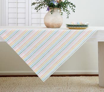 Thoughtfully hand-crafted of 100% pure linen, our Julia muted pastel multi-stripe tablecloth was inspired by the soft tones of the countryside. Made to dress up celebratory settings or pare down for everyday dining, this tablecloth displays lasting color and soften with each wash.