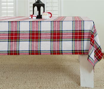 Add tradition and charm to your holiday table with our Stewart Plaid table throw. Inspired by Scottish design, this cheery tartan plaid tablecloth is woven of 100% pure linen makes a merry and bright holiday table.