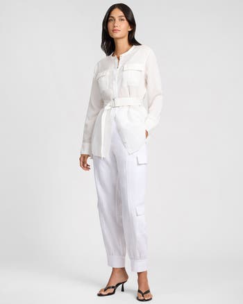 A fresh take on a utility shirt, this button-down is cut for an oversized fit with a removable D-ring belt to define the figure. It's made in a linen-Tencel blend with a covered placket and a shirttail hem.