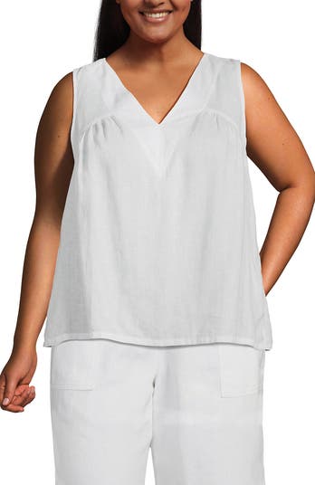 Here's a new angle on the essential linen top that you must add to your warm-weather wardrobe options. This sleeveless top has a v-neckline and boasts a looser silhouette. The front and back yokes add comfortable flow, making it an ideal choice for those balmy days. Lightweight and breathable with a cropped design that is fashionable and flattering.