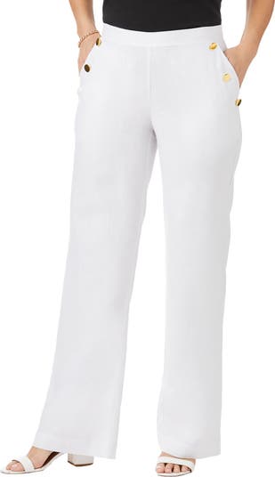 Make waves with this wide-leg linen pant detailed with sailor buttons at the hips. Back elastic waistband for easy pull-on styling. Pair with a linen blazer for a head-to-toe outfit that’s sunshine ready.