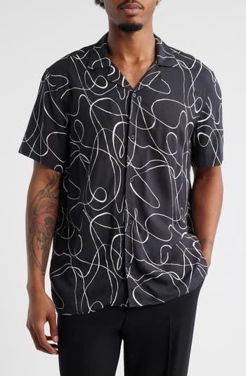Bright squiggles bring bold detailing to a camp shirt that's crafted from silky-soft viscose and designed to take you from sunny days to casual nights. The easy fit gives you room to move or relax in lightweight comfort.