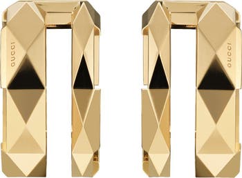 A sleek hexagonal design featuring logo-engravings is doubled in these 18-karat gold hoop earrings.