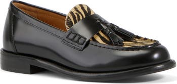 Zebra-print genuine calf hair reworks the look of a timeless tassel loafer fronted with a traditional moc-toe seam and set on a nonslip sole.
