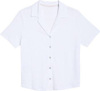 Cut from soft linen, this drapey camp shirt is framed by abbreviated sleeves for easy sunny-day styling.