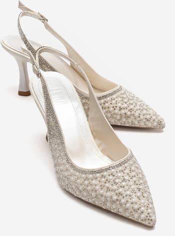 An elegant stiletto pump that elevates evening looks with delicate pearl and crystal embellishments and a sleek, feminine silhouette