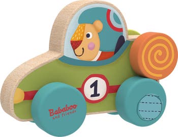 Bright colors, spinning discs, and storytelling fun make this wooden racecar toy a high-speed adventure in imaginative play. Little ones can race alongside Bababoo as he prepares for his first big competition. Colorful wooden discs spin as the car rolls, adding motion and sensory engagement. The illustrated play box doubles as a backdrop, inspiring open-ended scenes and character-driven stories. This Montessori-inspired toddler toy supports fine motor skills, coordination, and storytelling through hands-on movement. Designed in Europe, the Bababoo and friends® Bababoo Lion Racecar is crafted with durable materials for lasting, meaningful play.