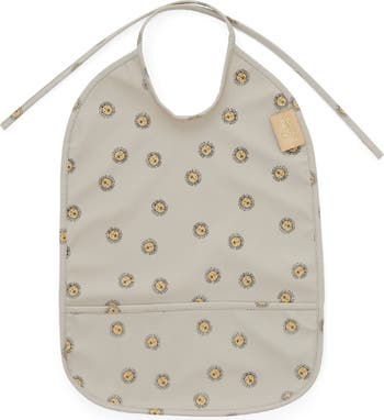 The bib is made of polyester and has a fine graphic pattern with lions etc. A small pocket at the bottom of the bib ensures that the excess food is seized so that it does not continue onto the child's clothing. The soft bib is closed with a tieband in the neck. The bib is made of 100% polyurethane. 30° gentle machine wash is recommended.